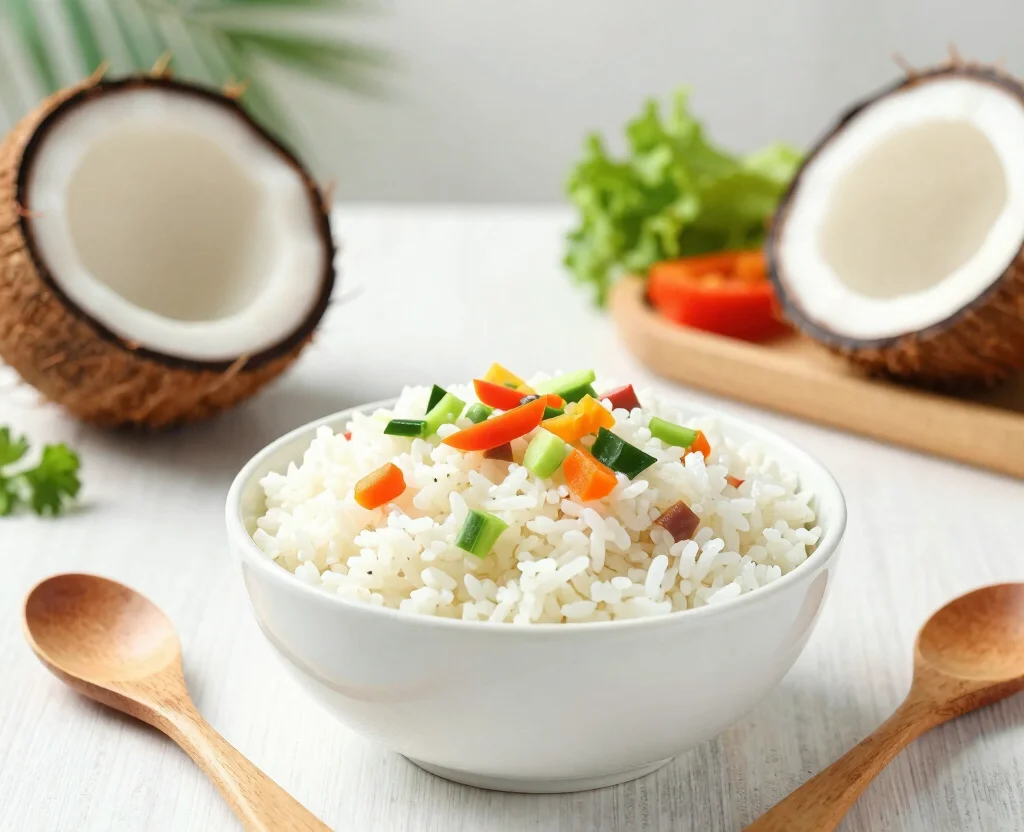 3. Stir in cooked rice and grated coconut, mixing everything well.