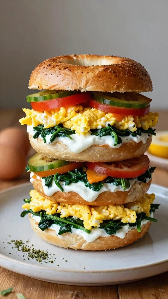 Start your day off right with hearty breakfast bagel sandwiches! Packed with protein and flavor, they feature scrambled eggs, sautéed spinach, and a creamy layer of Greek yogurt. Customize your sandwich with your favorite veggies or meats for a delicious breakfast treat. Great for busy mornings, these sandwiches will keep you energized throughout the day!