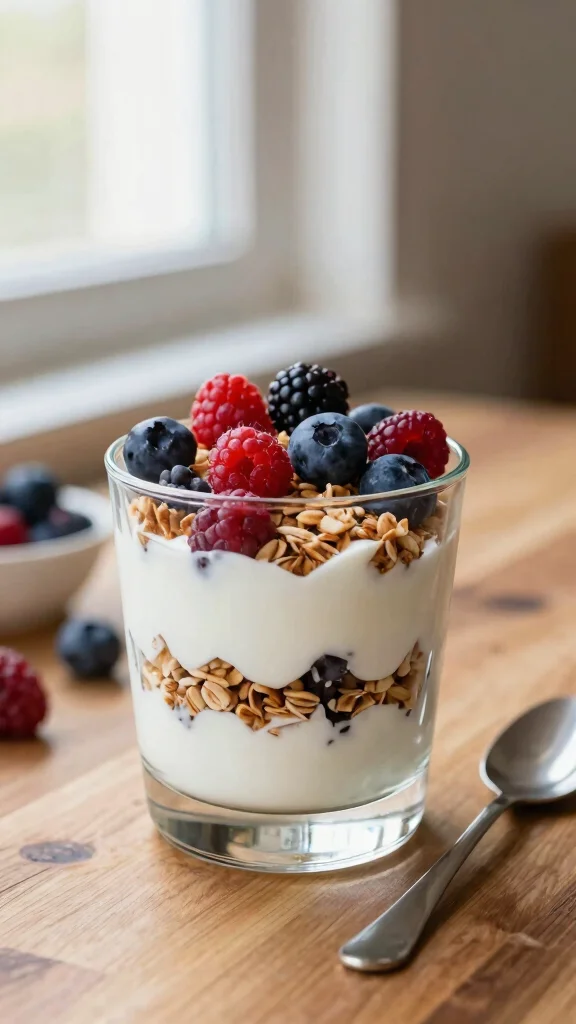 For breakfast ideas: a layered yogurt parfait with berries and granola; a quick Greek yogurt smoothie with banana and spinach; or a simple yogurt bowl with honey and chia. These are classic Greek yogurt breakfast ideas that are quick, tasty, and portable.