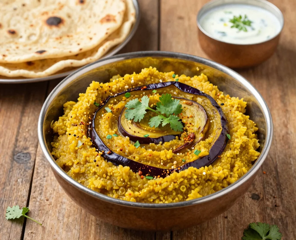 The roasting process enhances the eggplant’s natural sweetness, complemented by a blend of spices that creates a complex flavor profile. Pair it with chapati for a satisfying meal or enjoy it as a dip with crispy papad!