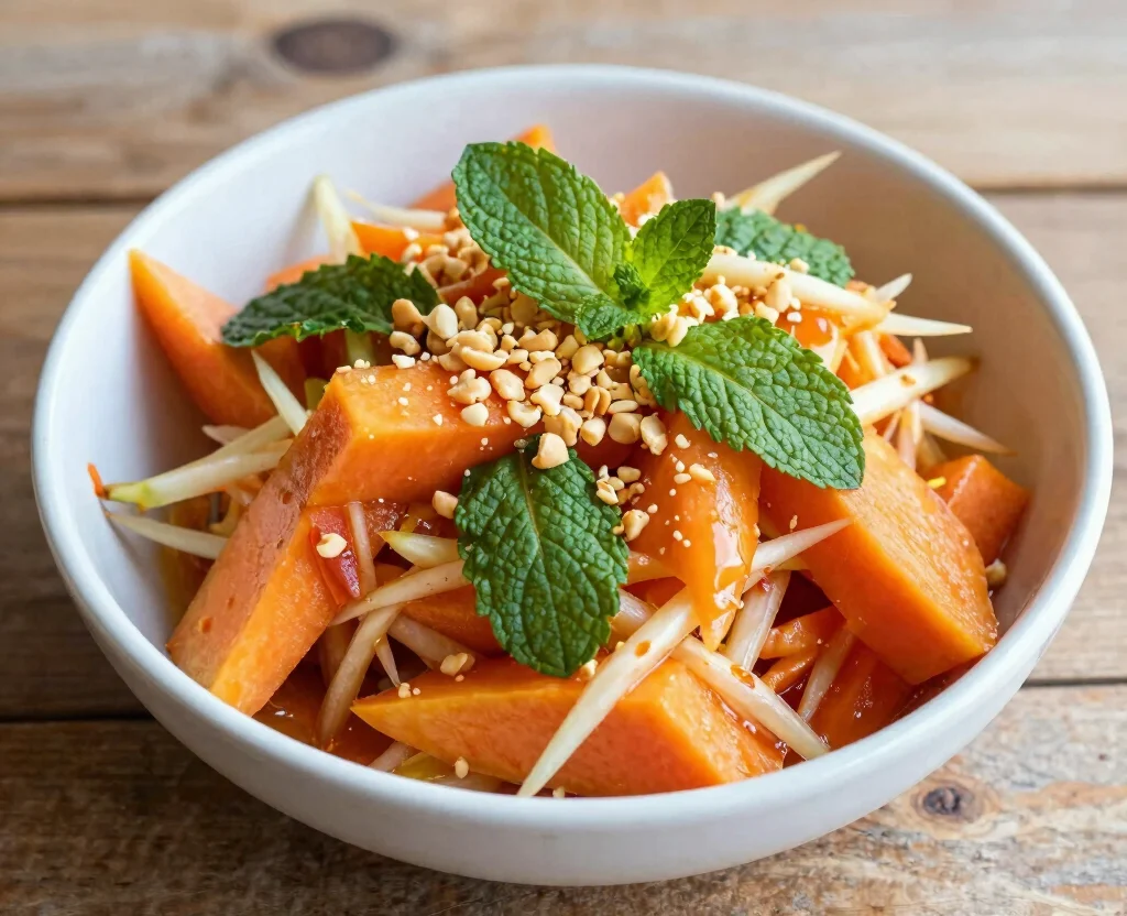 Craving a crunchy and flavorful dish? This Raw Papaya Salad is just the thing! Filled with fresh ingredients and bold flavors, the combination of papaya, lime, peanuts, and herbs creates a refreshing experience.