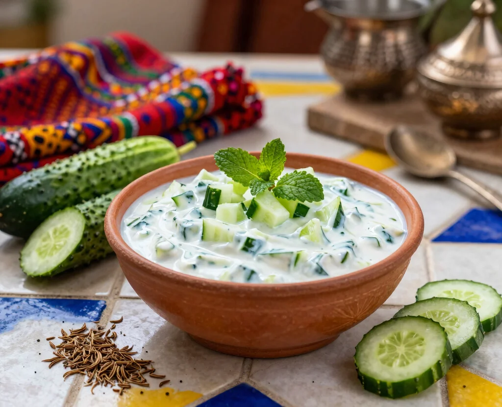 Looking for a quick and cooling side dish? This No-Cook Cucumber Raita is perfect for you! It brings together the refreshing taste of cucumbers and creamy yogurt to balance out spicy meals.