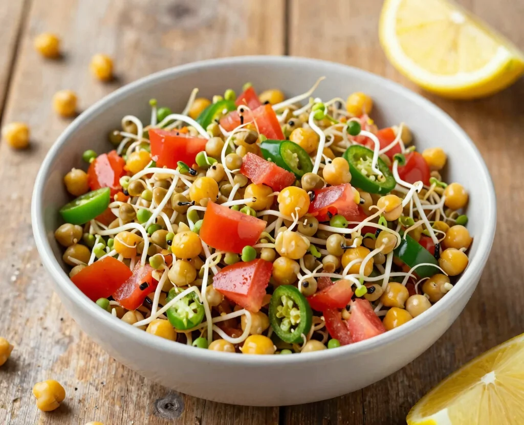 1. In a bowl, combine sprouted chickpeas, diced tomato, onion, and green chili.