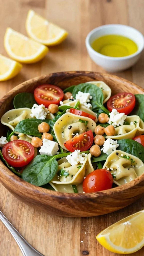 3. Greek Tortellini Salad with Spinach and Chickpeas