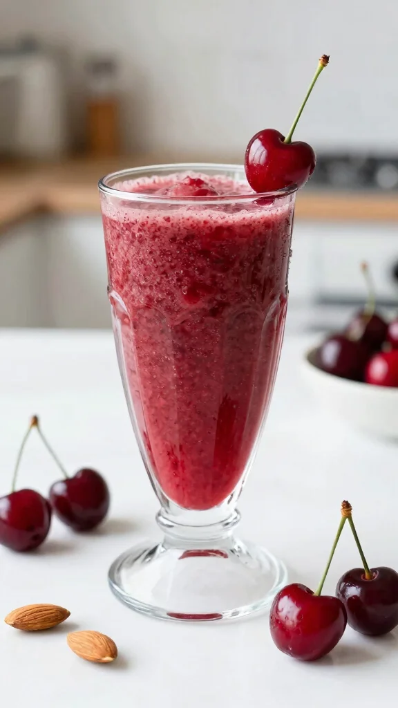 1. Blend cherries, almond butter, Greek yogurt, and almond milk until smooth.