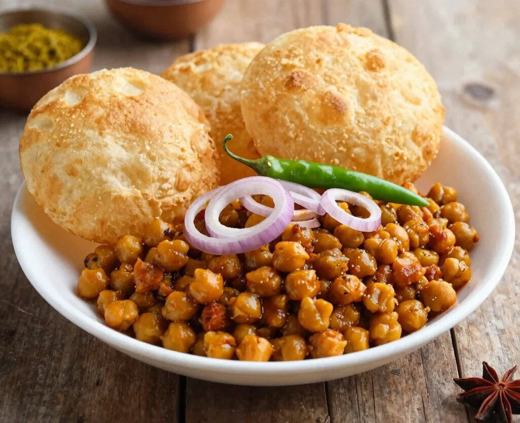 8. Serve chole hot with bhature, accompanied by onions and pickles.