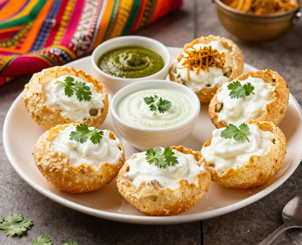 2. Fill each puri with yogurt, diced potatoes, and drizzle with sweet and green chutneys.