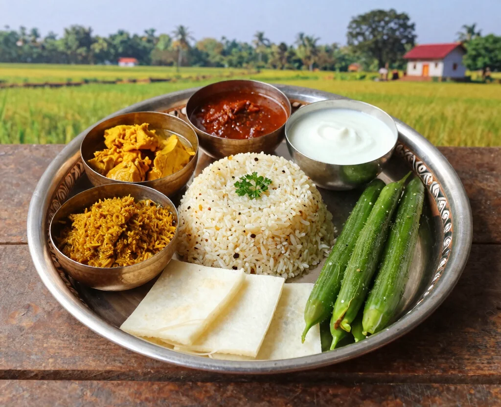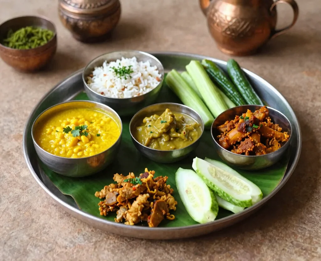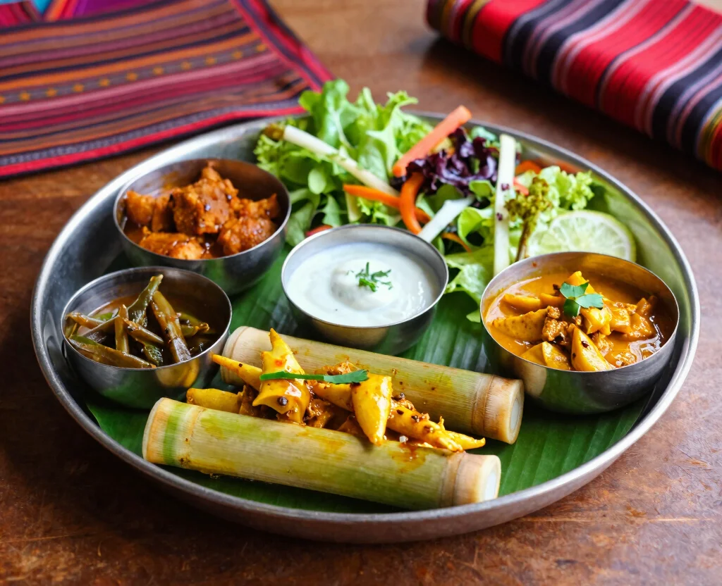 Are you excited to taste the diverse flavors of North-Eastern India? The North-Eastern thali showcases fresh vegetables and herbs, featuring Khar (a dish made from alkaline water), Bamboo Shoot Curry, and an array of colorful salads. Each dish tells a story of local culture and traditions, making your meal both aromatic and vibrant. This thali is perfect for health-conscious food lovers who appreciate nutritious and flavorful vegetarian dishes.