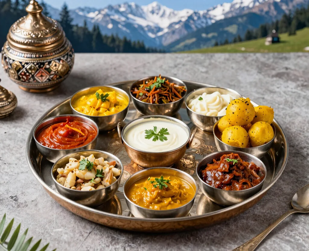 Are you in the mood for a meal that highlights rustic flavors? The Uttarakhand thali features Aloo ke Gutke (spicy potato), Gahat ki Dal (horse gram dal), and Badi (fried lentil dumplings). Each dish reflects the agricultural richness of the region, seasoned with local herbs and spices. This thali is not just about filling your stomach; it’s about nourishing your soul with wholesome, hearty food!