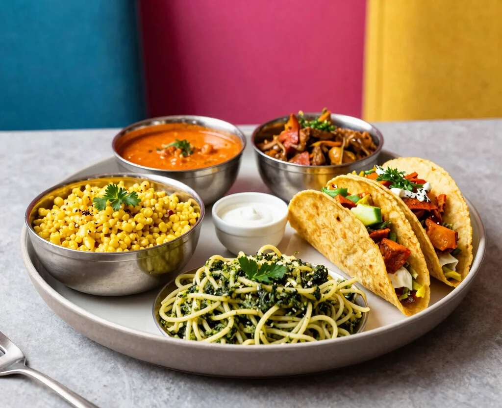 Are you ready for an exciting twist on traditional Indian flavors? A fusion Indian thali showcases creativity and innovation, featuring dishes like Quinoa Khichdi, Paneer Tacos, and Methi Pesto Pasta. This thali blends Indian flavors with contemporary dishes, making it perfect for parties or casual dining. With its vibrant presentation and diverse tastes, it invites everyone to explore a modern take on beloved classics.
