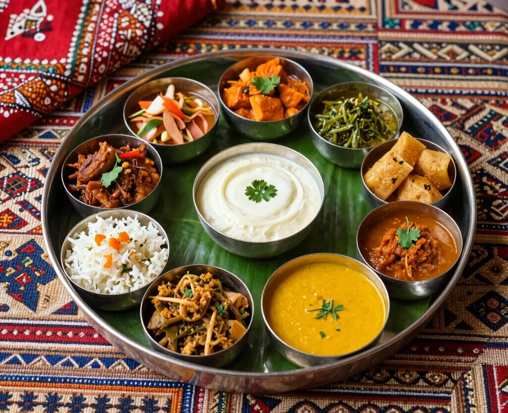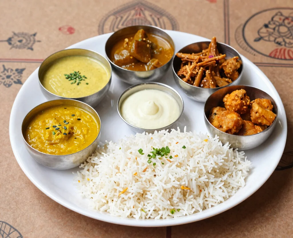 Are you looking for a meal that embodies purity and simplicity? A traditional Jain thali reflects the principles of non-violence and vegetarianism, featuring a variety of vegetable curries, Khichdi (rice and lentils), and a refreshing salad. Jain cuisine focuses on non-root vegetables, celebrating fresh produce for a wholesome meal. This thali is light yet satisfying, making it a delightful culinary experience.