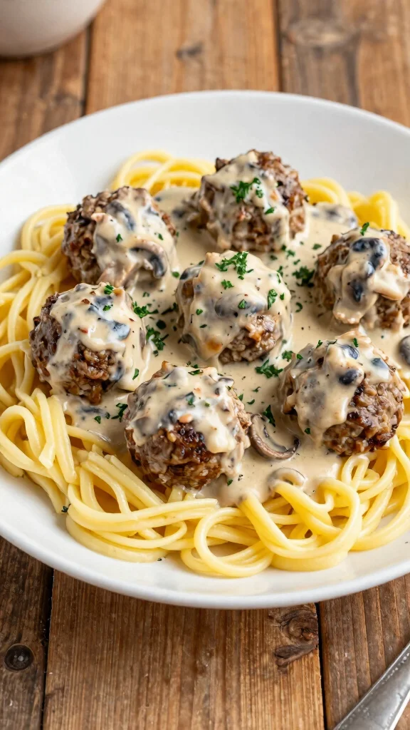 Craving something comforting and creamy? Try meatball stroganoff! This dish takes savory meatballs and pairs them with a rich sauce made from mushrooms, sour cream, and beef broth, served over egg noodles.