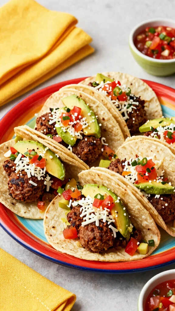 Spice up taco night with delicious meatball tacos! Ground beef meatballs are seasoned to perfection and served in soft tortillas, topped with fresh salsa, avocado, and cheese.