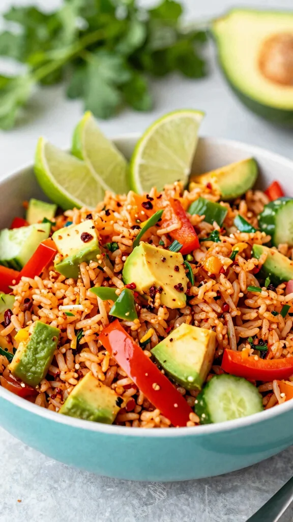 1. In a large bowl, combine the cooked rice, diced avocado, bell peppers, and cucumber.