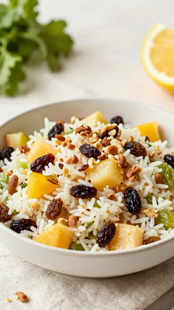 1. In a large bowl, combine the cooked rice, raisins, nuts, and diced apples or pears.