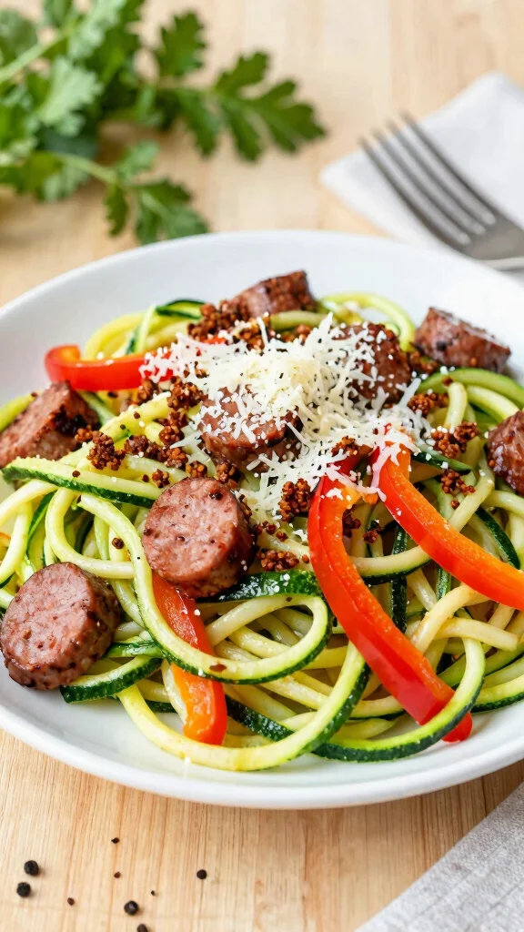 In the mood for a fresh, low-carb meal? This Italian sausage zoodle stir-fry is a delightful twist on traditional stir-fry! Using spiralized zucchini instead of noodles, this dish is vibrant and full of flavor. With savory Italian sausage, colorful bell peppers, and zoodles tossed in a tangy sauce, you get a satisfying meal that leaves you feeling light and energized. Quick to prepare, it’s perfect for busy weeknights. Serve warm, topped with grated parmesan for an extra touch of richness!