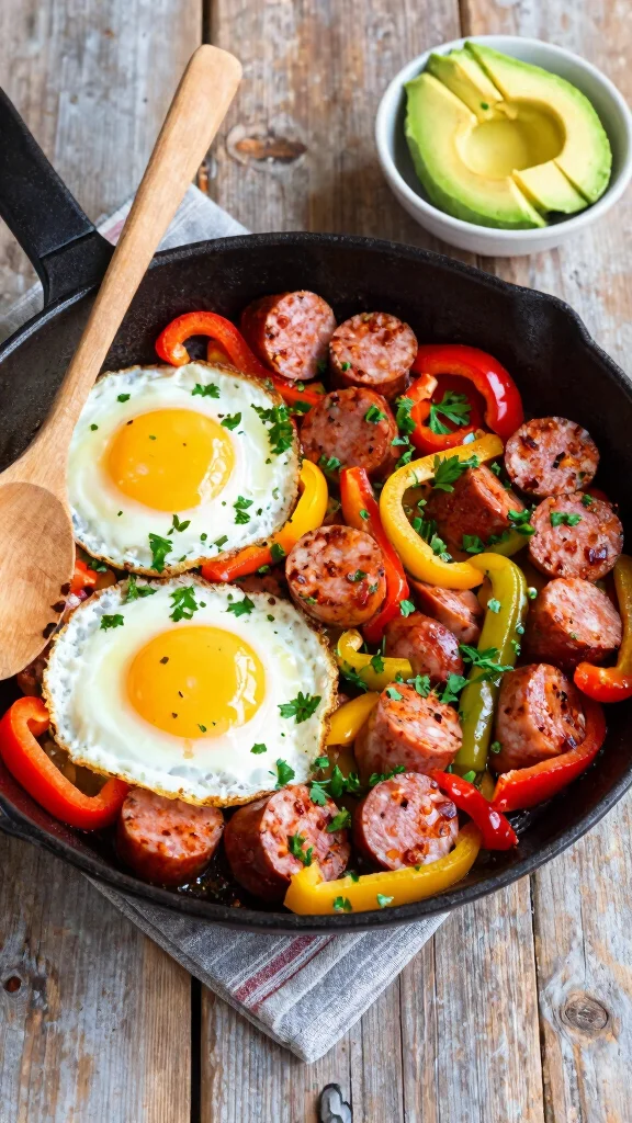 Try sausage and eggs skillet: sauté sliced Italian sausage with bell peppers and onions, then add whisked eggs for a quick breakfast.