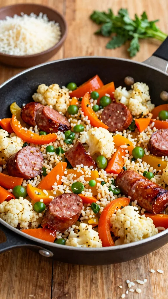 In search of a quick and flavorful dinner option? This Italian sausage and cauliflower rice skillet is a fantastic low-carb alternative that checks all the boxes! The sautéed Italian sausage complements the cauliflower rice beautifully, soaking up all the delicious seasonings. Brighten it up with fresh spinach and juicy cherry tomatoes for a meal that’s as colorful as it is nutritious. This one-pan wonder satisfies your cravings while keeping your healthy eating goals intact, all with minimal cleanup!