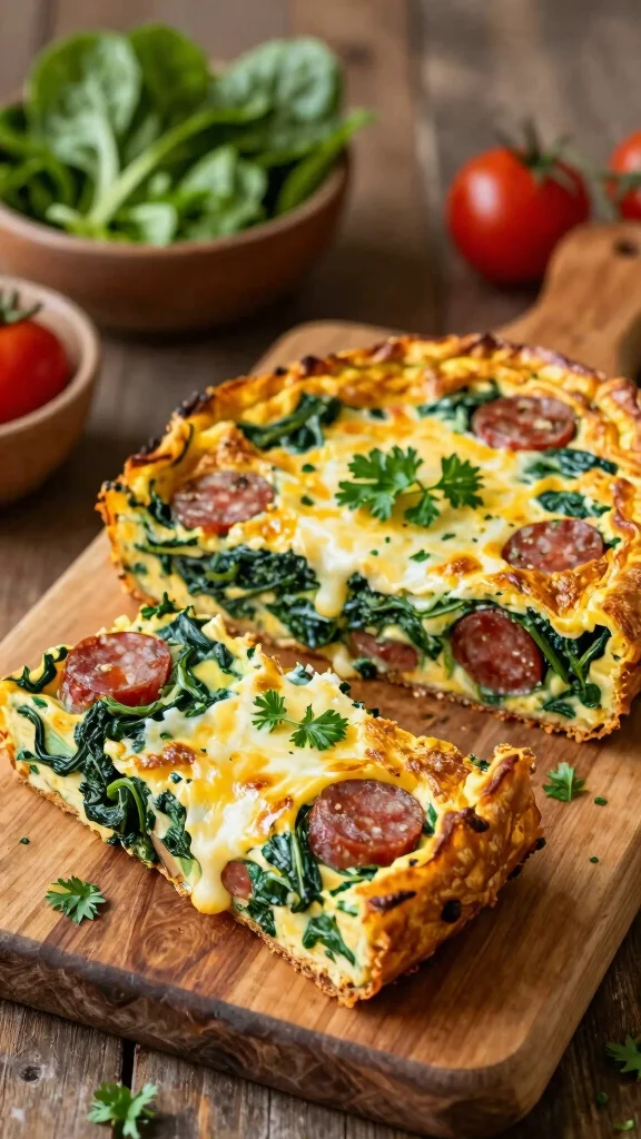 Another option is a sausage breakfast bake: crumble sausage with eggs, cheese, and spinach; bake until set.