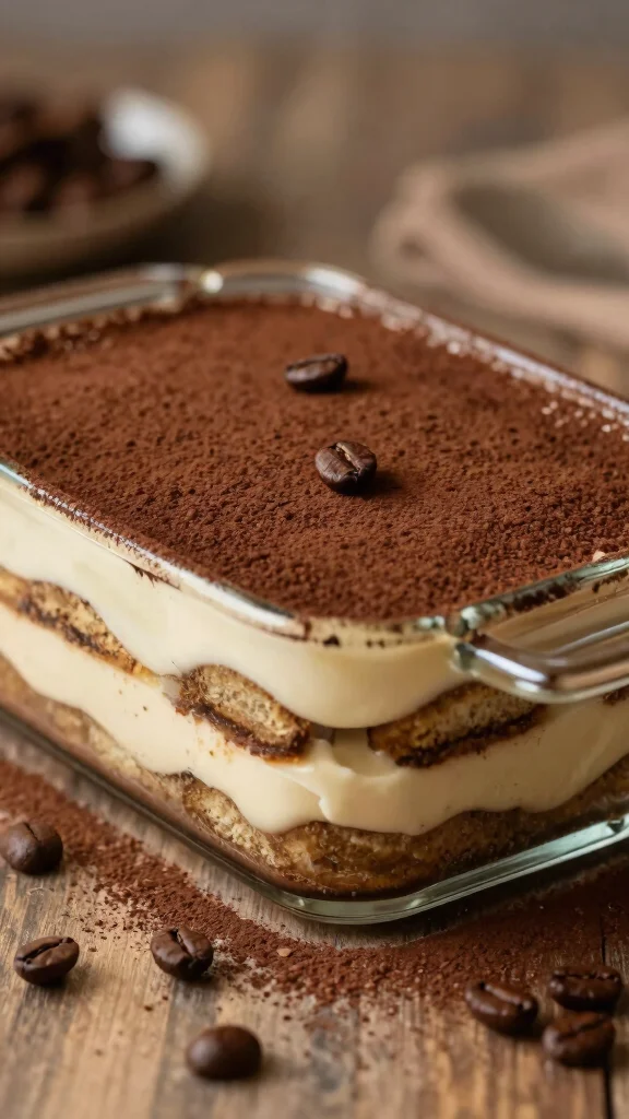 3. In a baking dish, layer soaked cake and mascarpone mixture, repeating layers until all ingredients are used.