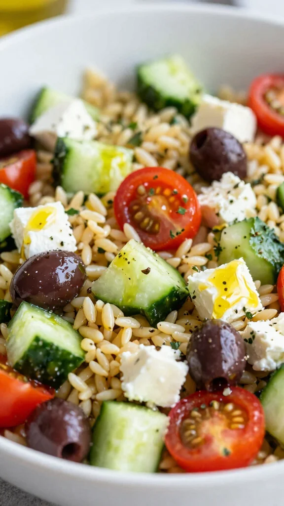 Keep the base: orzo greek salad base—orzo, cucumber, tomatoes, red onion, olives, and feta. Then customize: swap feta for a dairy-free option or add chickpeas for protein, or grill chicken or shrimp for a heartier version. For classic Greek cuisine flavor, use a lemon-oregano vinaigrette and finish with fresh dill or parsley. To push it toward a broader Mediterranean salad profile, fold in roasted red peppers, artichoke hearts, or sun-dried tomatoes. This approach keeps you enjoying orzo recipes while tailoring flavors to your taste.