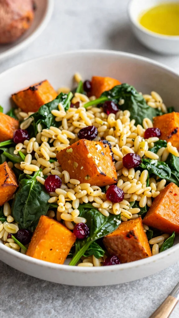 3. In a large bowl, combine roasted sweet potatoes, orzo, spinach, and cranberries.