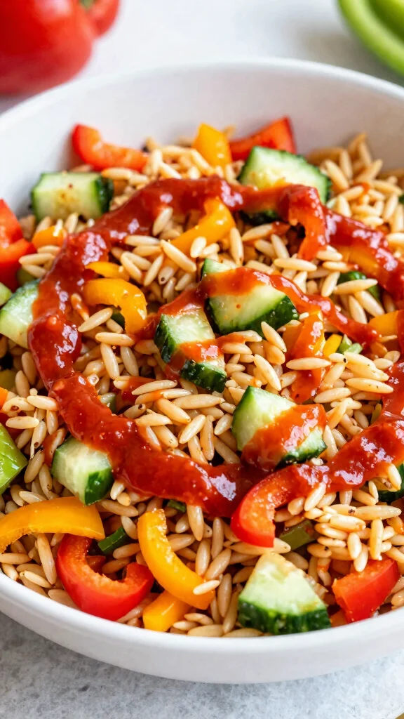 Want a salad with a kick? The Spicy Orzo Salad with Sriracha is just what you need! This dish features the heat of Sriracha combined with fresh veggies for a flavorful experience that’s both exciting and satisfying.With colorful bell peppers and cucumbers, this salad is not only delicious but also visually enticing, making it perfect for summer BBQs or a zesty lunch!