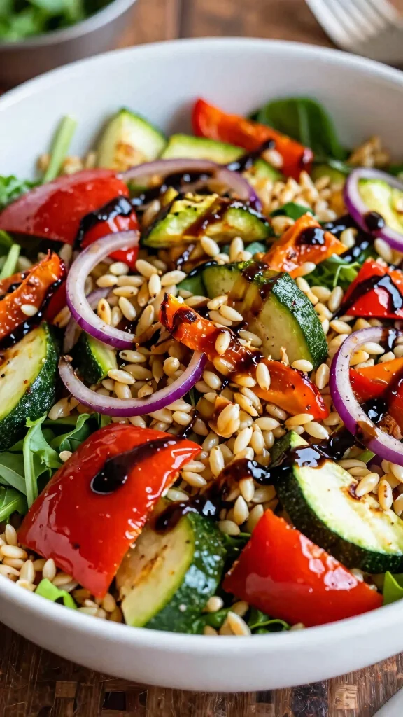 Craving something colorful and hearty? The Roasted Vegetable Orzo Salad is a delightful mix of seasonal veggies roasted to perfection. Each bite offers a smoky sweetness from bell peppers, zucchini, and red onions, making it a fantastic option for lunch or dinner.With orzo for texture and a tangy balsamic vinaigrette, this salad not only tastes great but also helps you incorporate more vegetables into your diet!