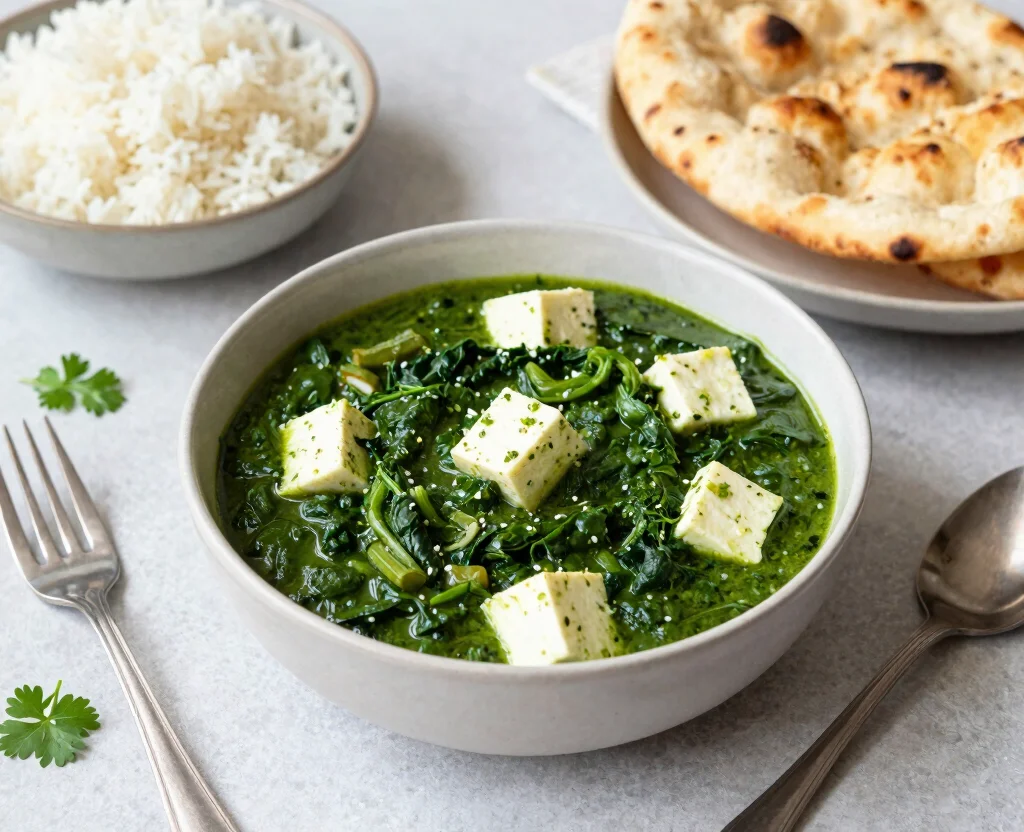 Key ingredients include fresh spinach, paneer, onions, tomatoes, garlic, ginger, green chilies, cumin seeds, garam masala, kasuri methi, and a dairy or dairy-free creamy element. Steps: 1) Blanch spinach and puree until silky. 2) Sauté onion, garlic, and ginger in oil until golden. 3) Add spices and tomatoes to form a base. 4) Stir in the spinach puree and simmer until glossy. 5) Gently fold in paneer cubes and finish with cream or cashew paste. This keeps the dish convenient for easy Indian recipes while delivering a restaurant-worthy texture.