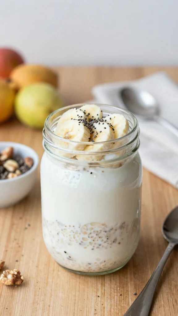 • Overnight oats with yogurt: mix rolled oats, plain Greek yogurt, milk, chia seeds, and fruit in a jar; refrigerate overnight for a grab‑and‑go morning.