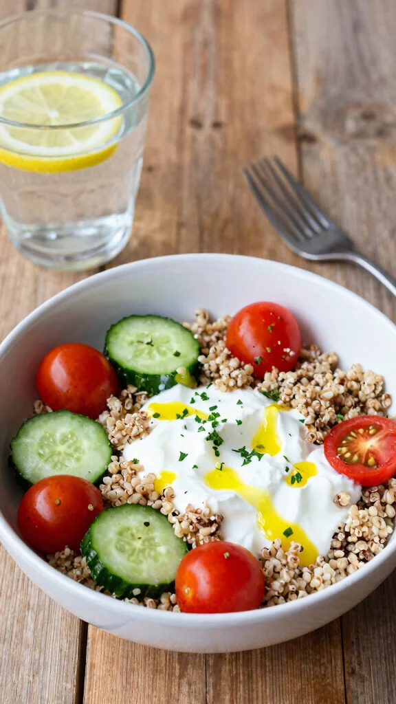 • Quinoa bowls with yogurt‑tahini drizzle: cooked quinoa and roasted vegetables topped with a lemon‑tahti yogurt sauce for extra protein.