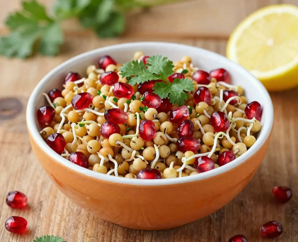 1. In a bowl, combine sprouted moong beans and pomegranate seeds.